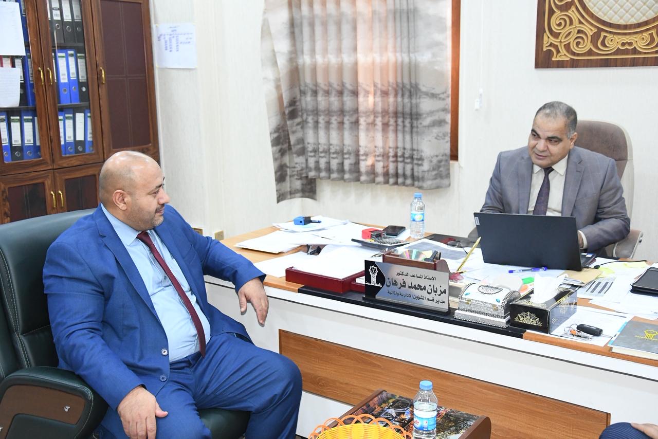 Professor Dr. Hassan Hussein Ibrahim, Assistant President of Tikrit University for Scientific Affairs, visited Assistant Professor Dr. Mizban Mohammed Farhan, Director of the Administrative and Financial Affairs Department, to extend his congratulations and best wishes on the occasion of his appointment to the position.