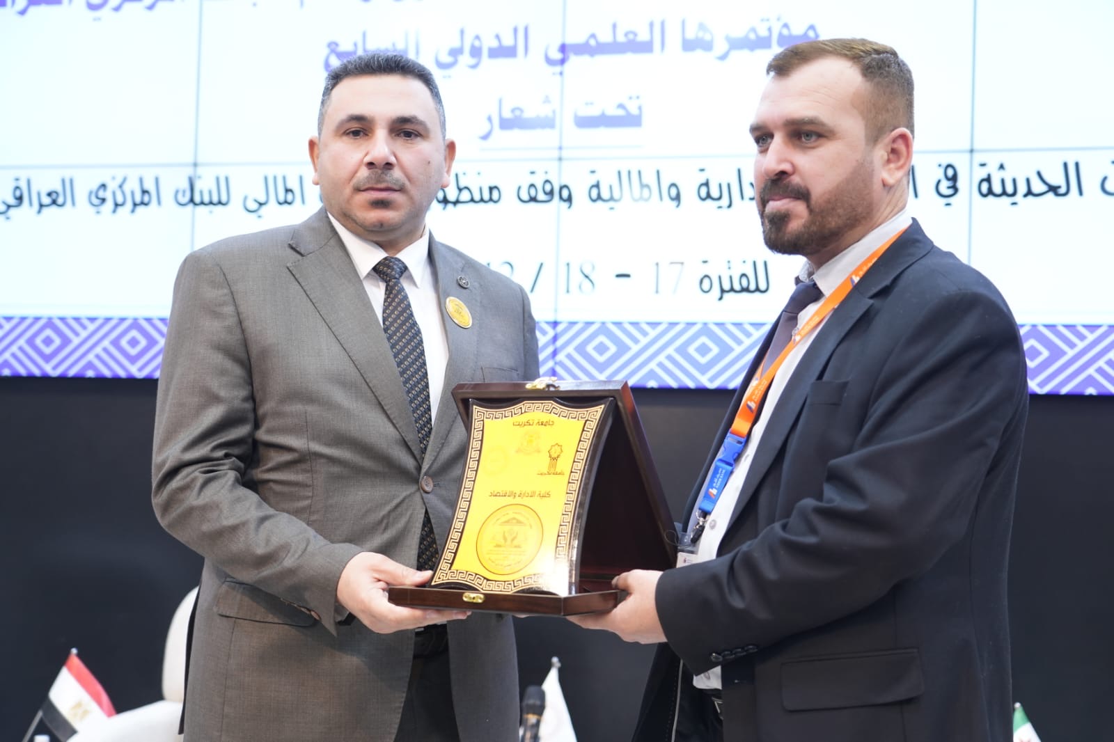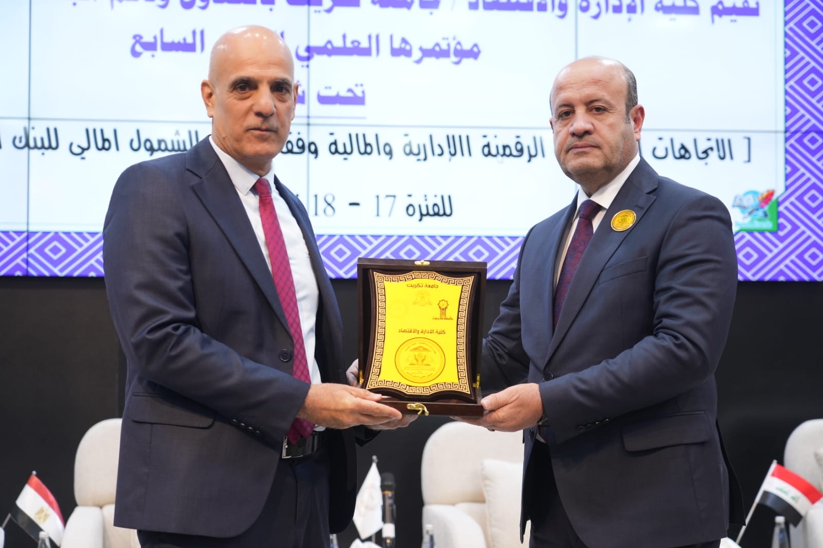 At the conclusion of the opening session, the President of the University, the speakers, and guests were honored with conference shields and shields of the Central Bank of Iraq. The Financial Inclusion Exhibition, organized by the Central Bank of Iraq in cooperation with the Iraqi Private Banks League, was also inaugurated in the courtyard of the College of Administration and Economics.