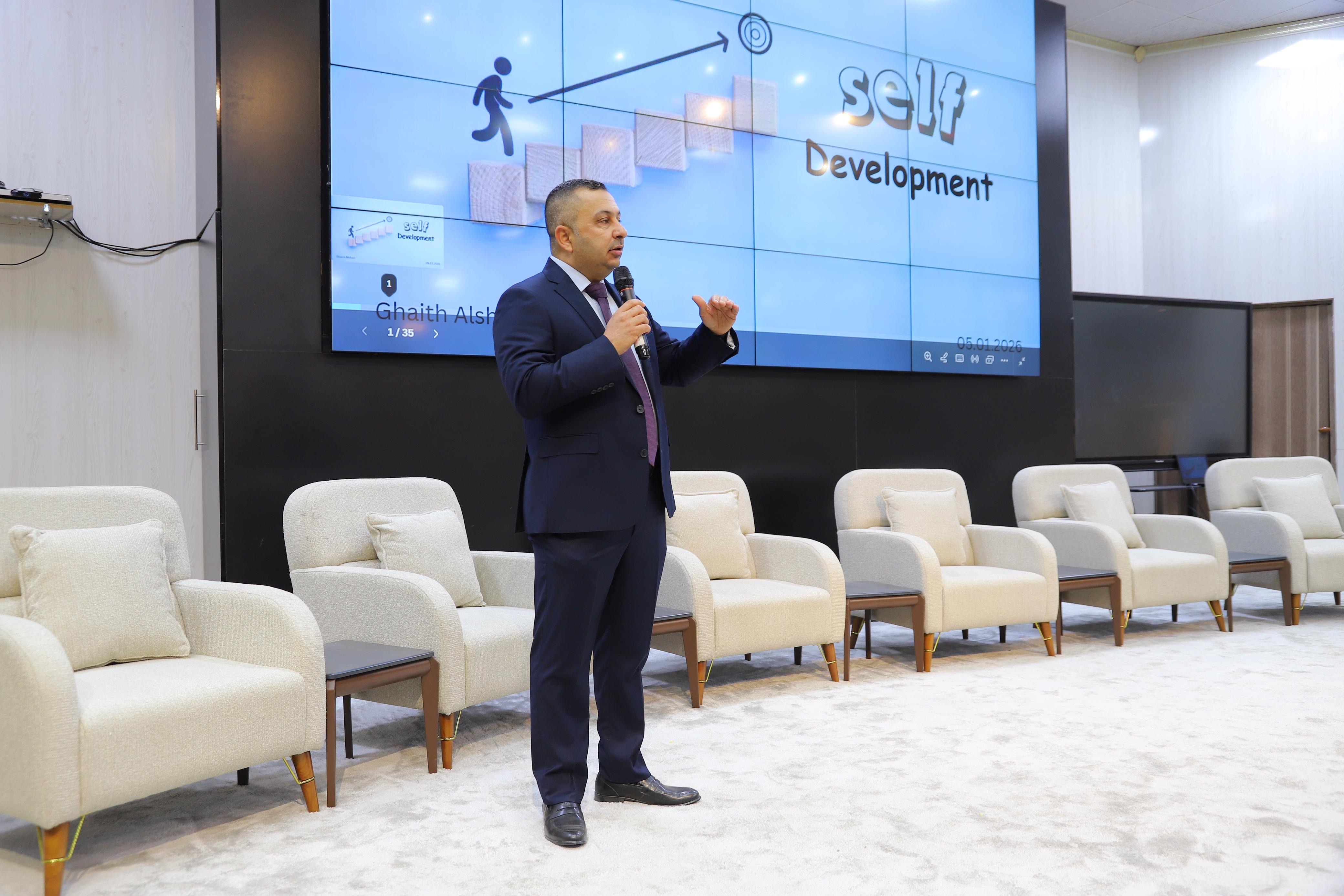 The seminar, moderated by Assistant Professor Dr. Yassin Faraj Yassin, Assistant Lecturer Ghaith Adnan Khalil from the Northern Technical University – Kirkuk, and Assistant Lecturer Samar Ahmed Khalaf, aimed to shed light on the concept of self-development and its importance in building an individual’s personality at both the academic and professional levels, developing personal abilities and skills, enhancing self-confidence, and achieving balance between the scientific and practical aspects of students’ lives.