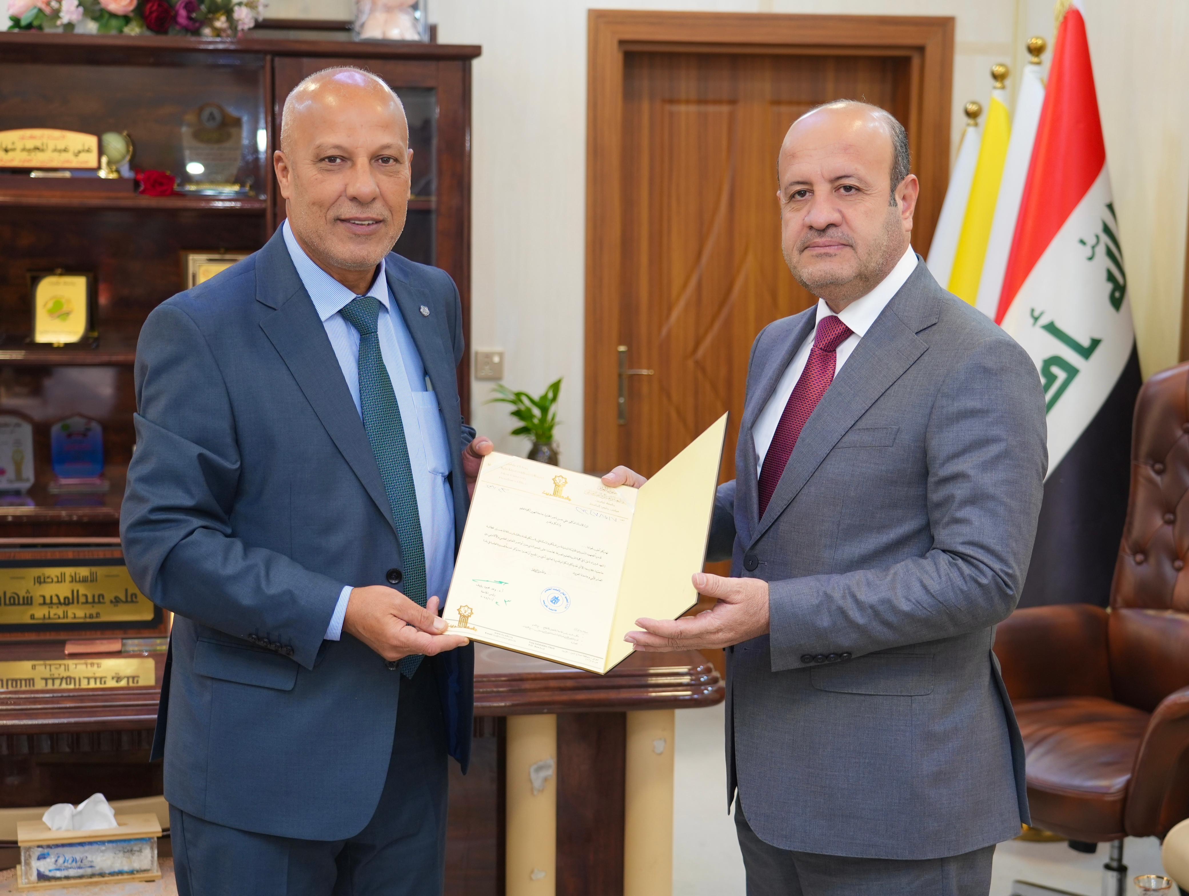 As part of strengthening scientific and academic cooperation between Tikrit University and other Iraqi universities, Professor Dr. Waad Mahmoud Raouf, President of Tikrit University, honored Professor Dr. Ali Hassan Nasser, a faculty member at Al-Nahrain University and Director of Special Grades at the Ministry of Higher Education and Scientific Research. The recognition came in appreciation of his scientific efforts and active participation as the chair of the master’s thesis defense committee for graduate student Shahad Shezad Nameq from the College of Education for Pure Sciences.