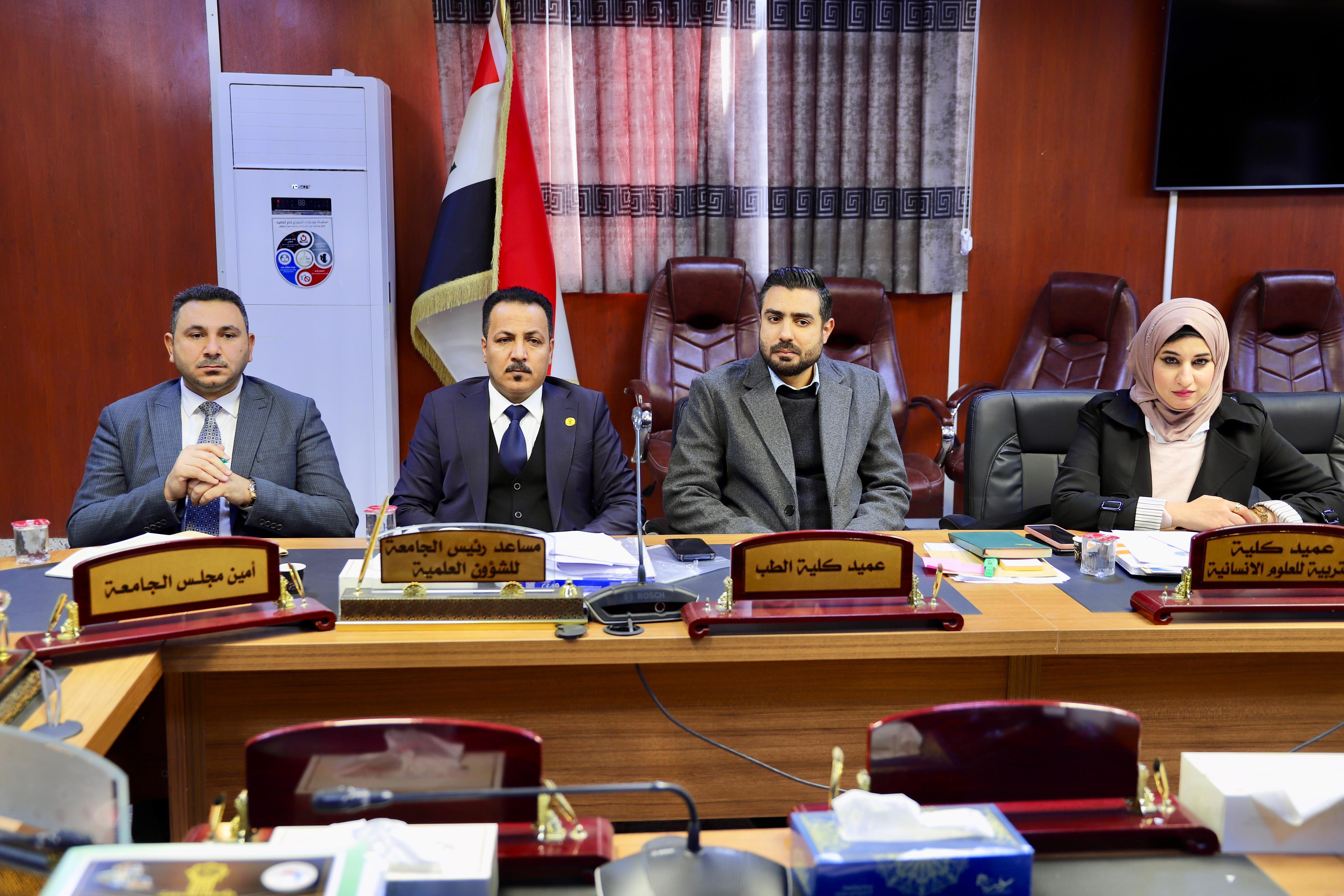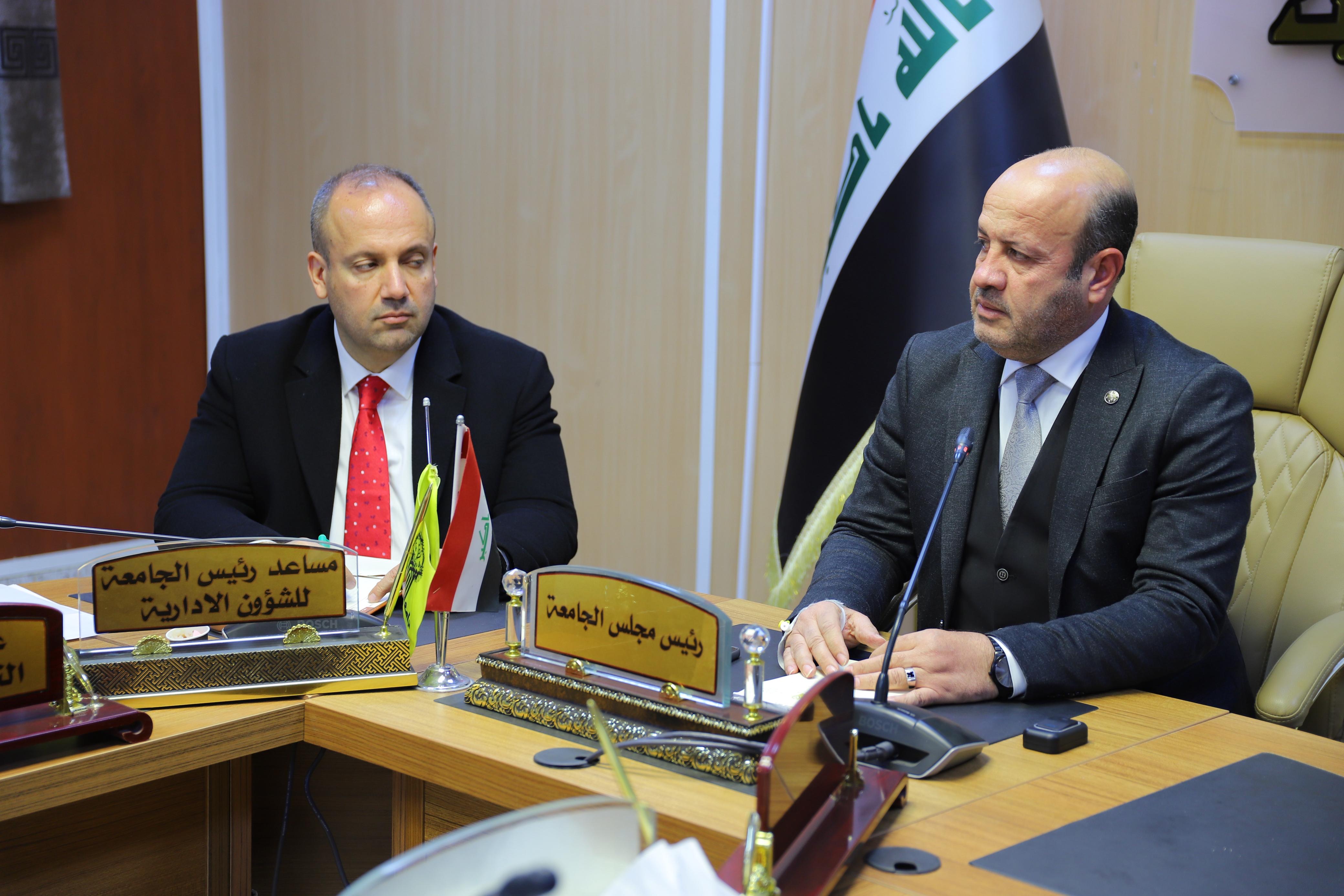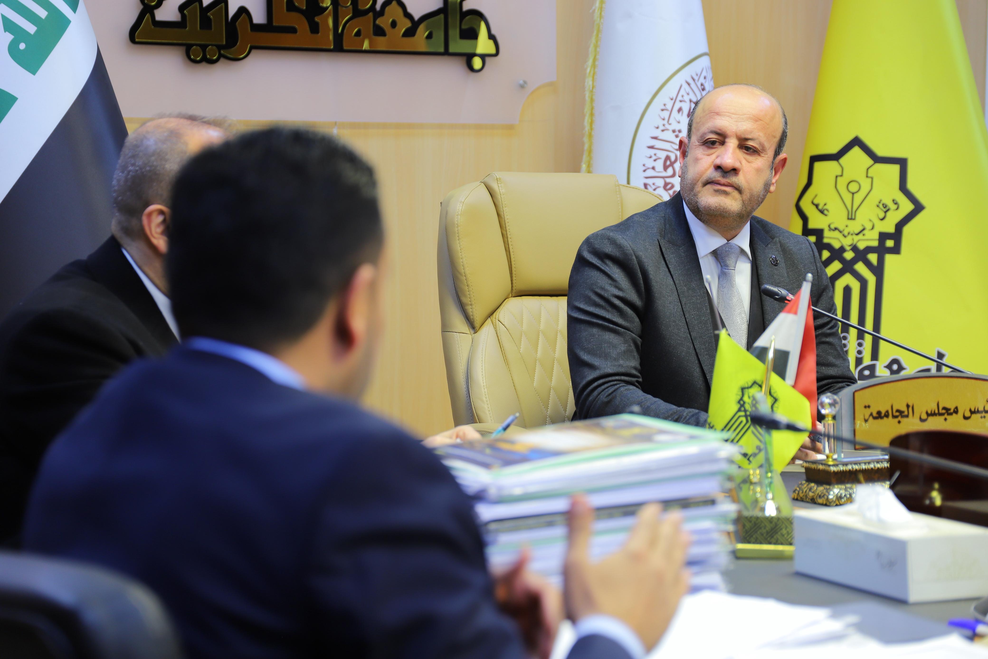 The President of Tikrit University, Professor Dr. Waad Mahmoud Raouf, met on Monday with the members of the Central Committee for Evaluating Institutional Accreditation Reports at the University Presidency, as part of ongoing follow-up on institutional accreditation procedures and the assessment of the level of progress achieved in the university’s colleges and centers.