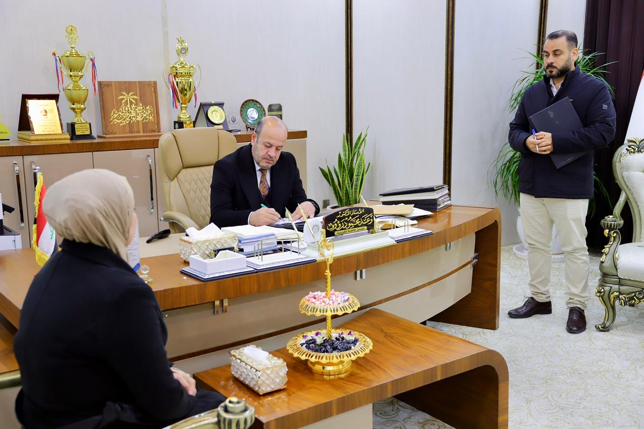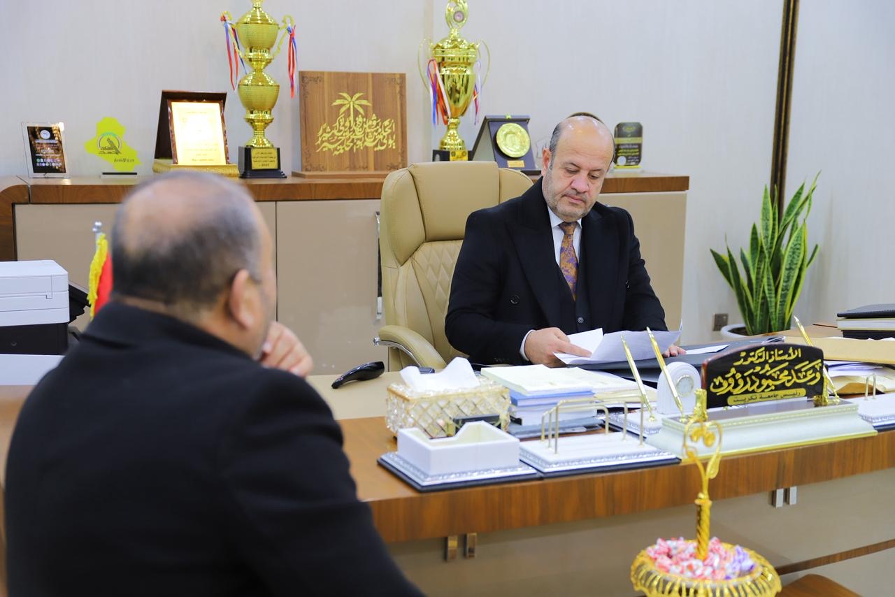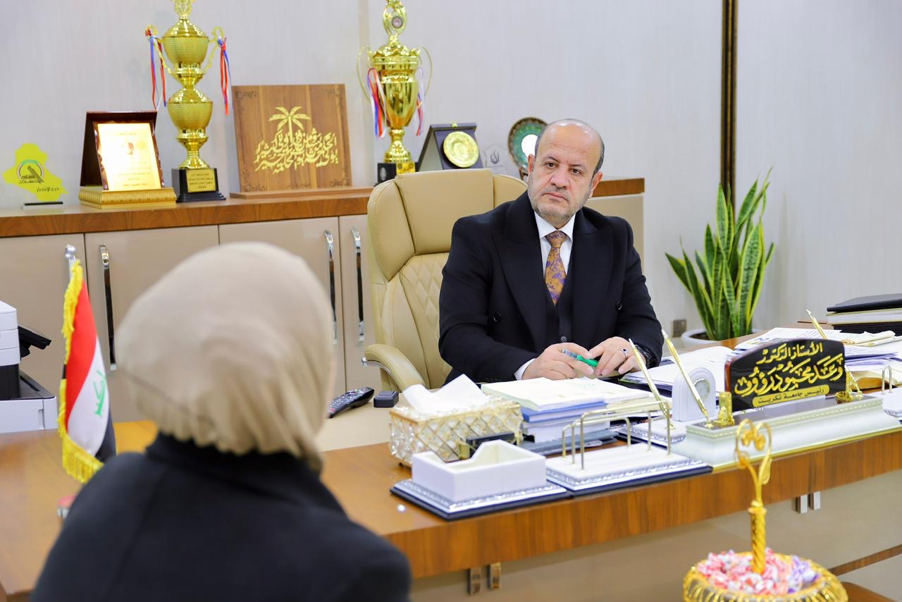 Professor Dr. Waad Mahmoud Raouf, President of Tikrit University, received in his office on Tuesday, 30/12/2025, a number of university staff members, citizens, and students, as part of the weekly meeting program he allocates to review their requests and follow up on their affairs.