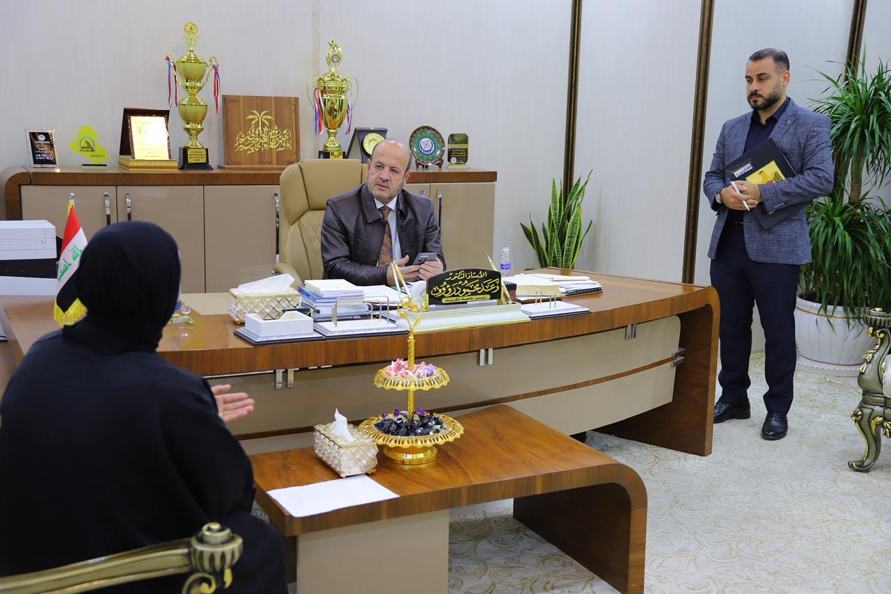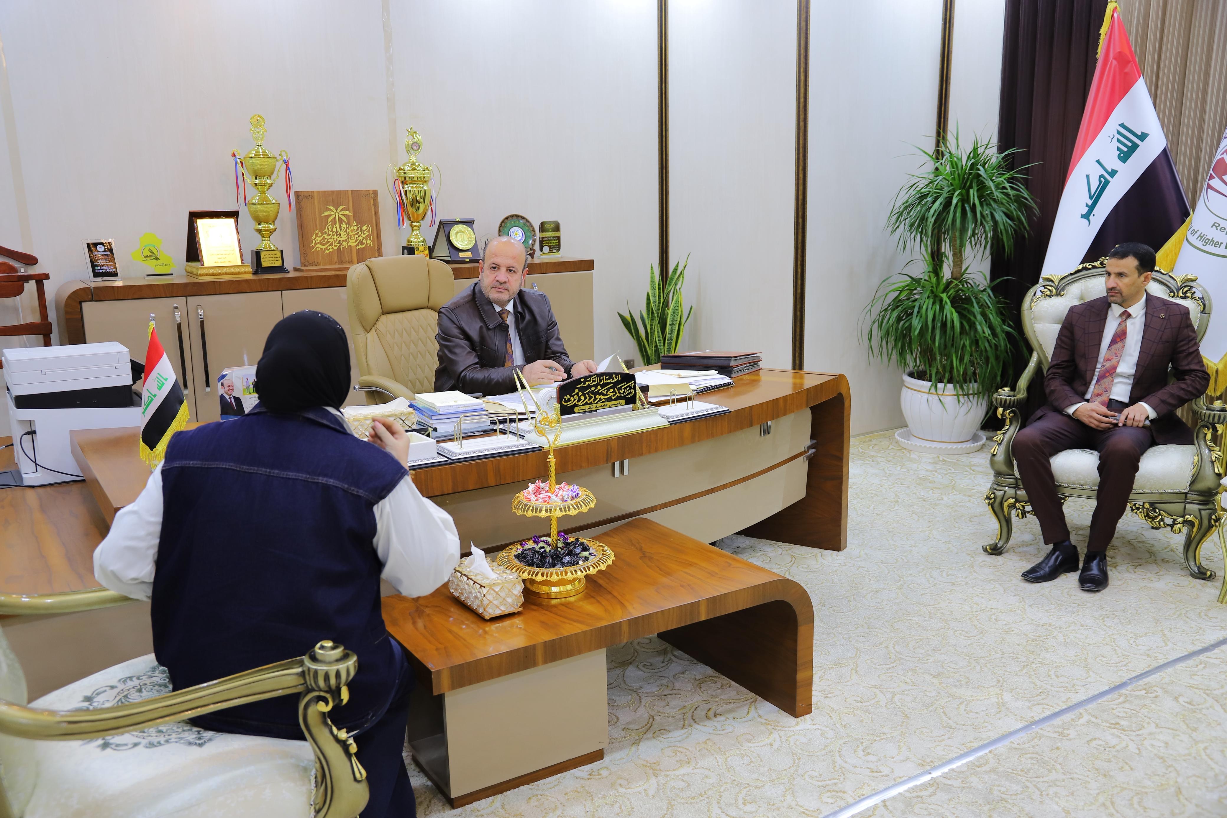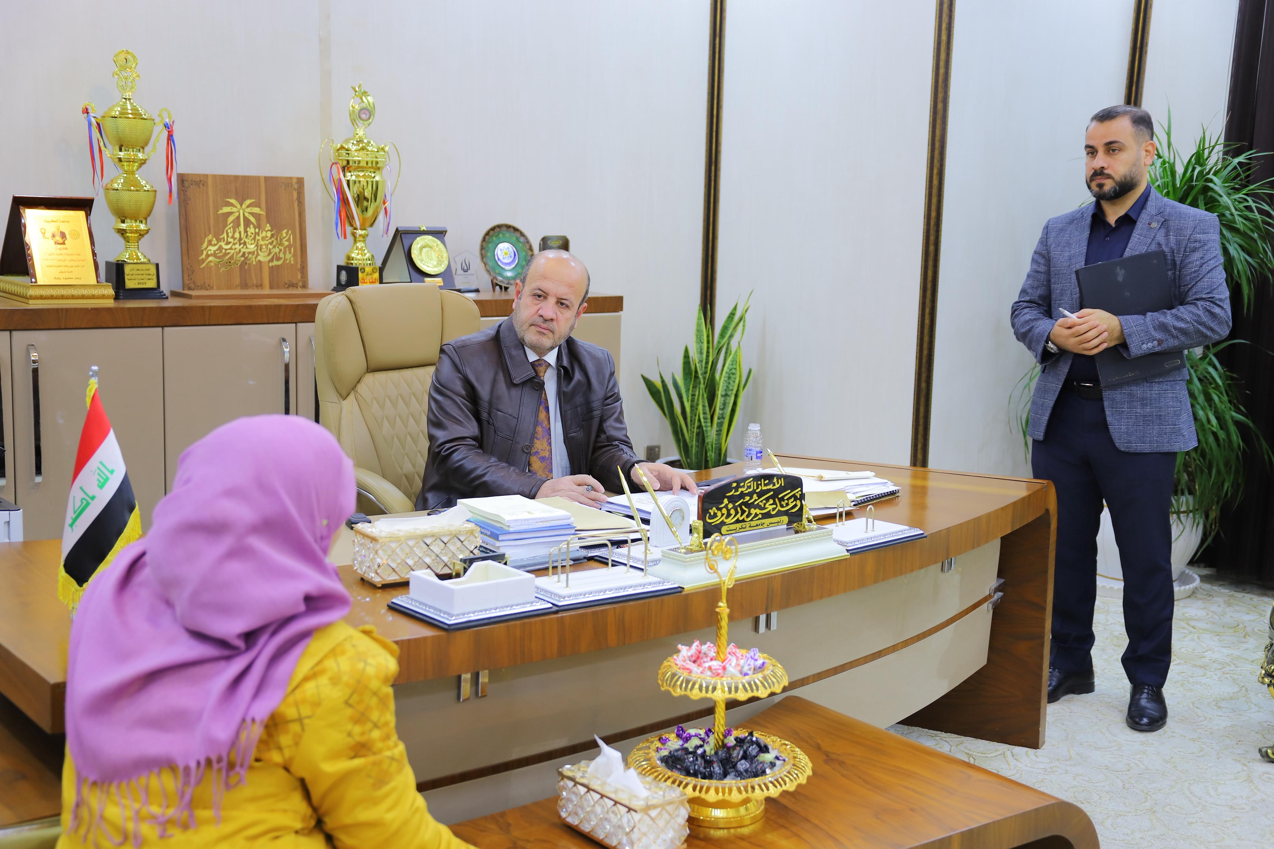 The President of Tikrit University, Professor Dr. Waad Mahmoud Raouf, received a number of university staff members, citizens, and students as part of the weekly meeting program he allocates to review their requests and follow up on their affairs.