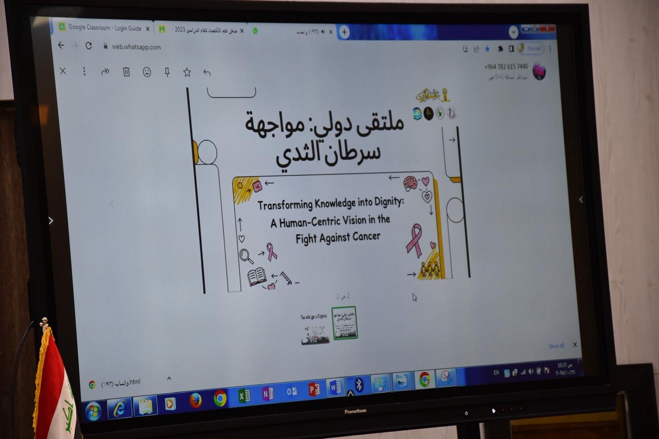 Under the patronage of the President of Tikrit University, Professor Dr. Waad Mahmood Raouf, and the supervision of the Assistant President for Scientific Affairs, Professor Dr. Hassan Hussein Ibrahim, with the follow-up of the Dean of the College of Political Science, Professor Dr. Qasim Alwan Saeed, the Women’s Affairs Unit at the University Presidency organized, in cooperation with the Prime Minister’s Office / the National Committee for Community Awareness and Guidance and the Salahuddin Health Directorate — and with the participation of reputable Arab and international universities and scientific institutions — the 10th International Hybrid Forum on Confronting Breast Cancer, titled “From Knowledge to Dignity” and held under the slogan “From Pain Comes Meaning,” in celebration of Pink October.